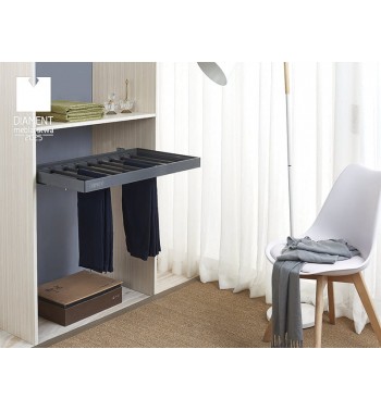 Nowoczesny wieszak na spodnie WB-662 to doskonałe rozwiązanie do przechowywania spodni w Twojej garderobie. Charakteryzuje się minimalistycznym designem i elegancką konstrukcją, dzięki czemu doskonale wpasowuje się w każde nowoczesne wnętrze, dodając luksusowego i świeżego wyglądu. Wyposażony w prowadnicę dolnego montażu (cechującą się niewidocznym mocowaniem) sprawi, że wnętrze każdej garderoby będzie się elegancko prezentować.