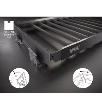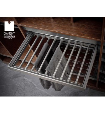 Wieszak na spodnie z serii SYMPHONY wyposażony jest w system pełnego wysuwu, który pozwala na całkowite wysunięcie się wieszaka. Dzięki temu uzyskasz łatwy dostęp do wszystkich przechowywanych rzeczy, nawet tych umieszczonych na samym tyle. System pełnego wysuwu zapewnia płynne i stabilne działanie, co zwiększa komfort użytkowania i ułatwia organizację przestrzeni.