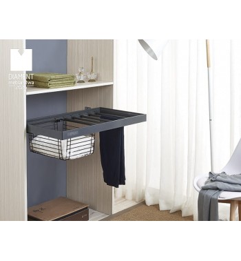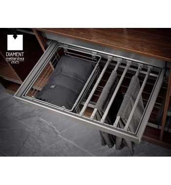 Wieszak na spodnie wraz z koszem WB-663 to doskonałe hybrydowe rozwiązanie do przechowywania spodni na wieszaku oraz odzieży czy bielizny w koszu. Charakteryzuje się minimalistycznym designem i elegancką konstrukcją, dzięki czemu doskonale wpasowuje się w każde nowoczesne wnętrze, dodając luksusowego i świeżego wyglądu. Wyposażony w prowadnicę dolnego montażu (cechującą się niewidocznym mocowaniem) sprawi, że wnętrze każdej garderoby będzie się elegancko prezentować.