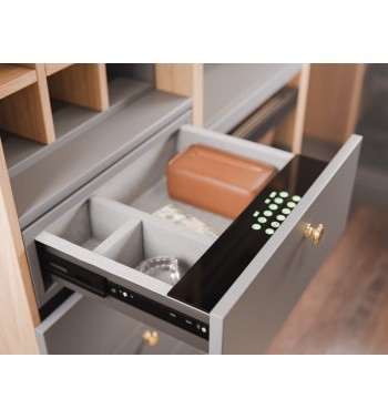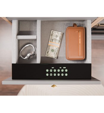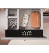 Wnętrze sejfu zostało wyłożone delikatnym welurem, który chroni przechowywane przedmioty, a dodatkowo jest bardzo miły w dotyku. Dzięki temu sejf jest doskonałym rozwiązaniem do przechowywania biżuterii, zegarków i delikatnych akcesoriów bez obaw o ich zarysowanie.