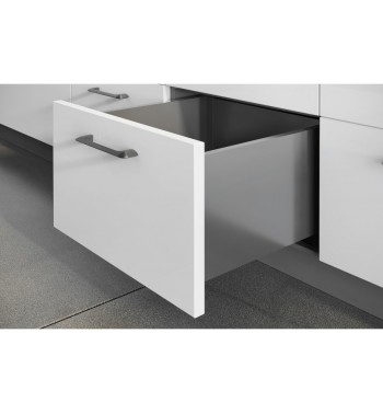 Cienki płaszcz boczny o szerokości zaledwie 14 mm nadaje szufladzie prosty i nowoczesny wygląd, a wykończenie systemu w bieli lub antracycie umożliwia stworzenie wielu niecodziennych aranżacji. Wąski bok zapewnia również więcej miejsca w szufladzie i dodaje jej lekkości.