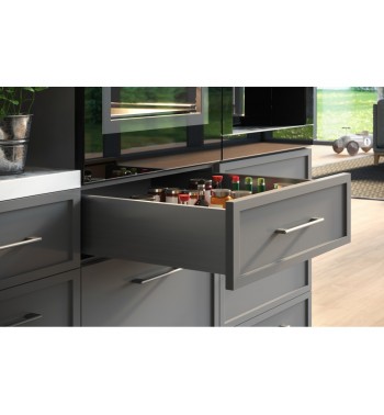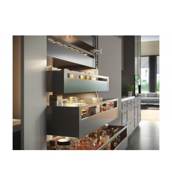 Cienki płaszcz boczny o szerokości zaledwie 14 mm nadaje szufladzie prosty i nowoczesny wygląd, a wykończenie systemu w bieli lub antracycie umożliwia stworzenie wielu niecodziennych aranżacji. Wąski bok zapewnia również więcej miejsca w szufladzie i dodaje jej lekkości.