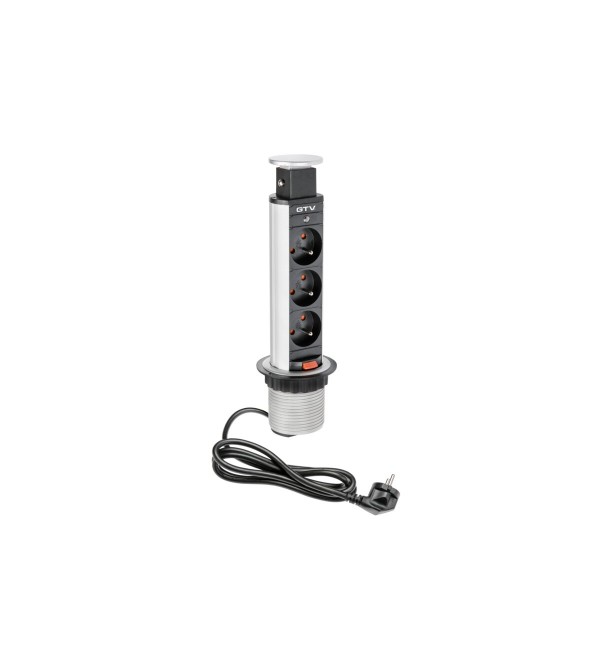 Wysuwany przedłużacz biurkowy z trzema gniazdami 230V do montażu w blacie, zapewniający wygodny dostęp do zasilania w biurze, kuchni lub przy stanowisku pracy.